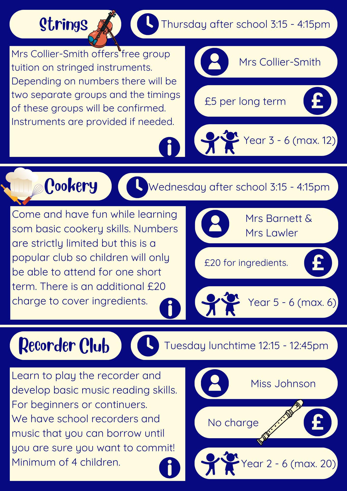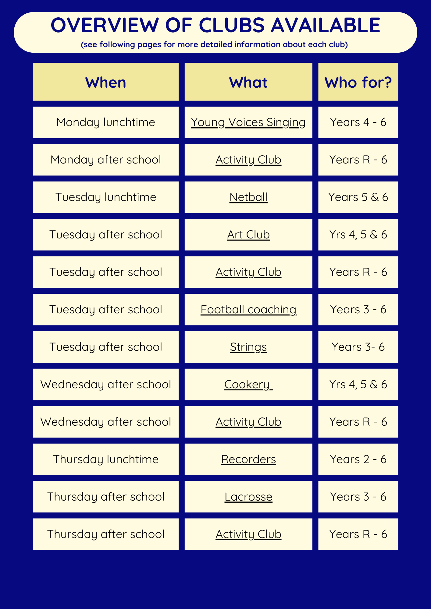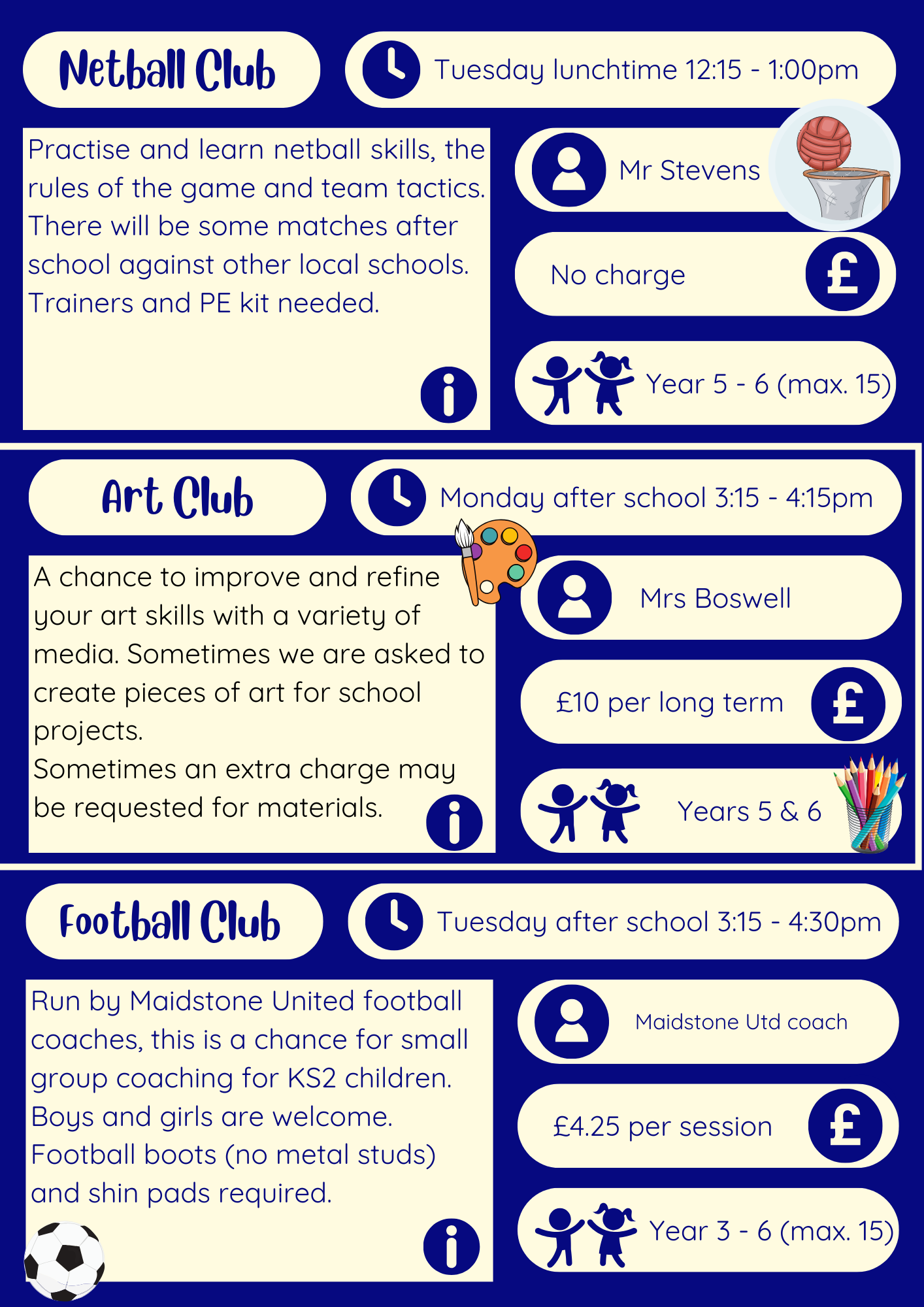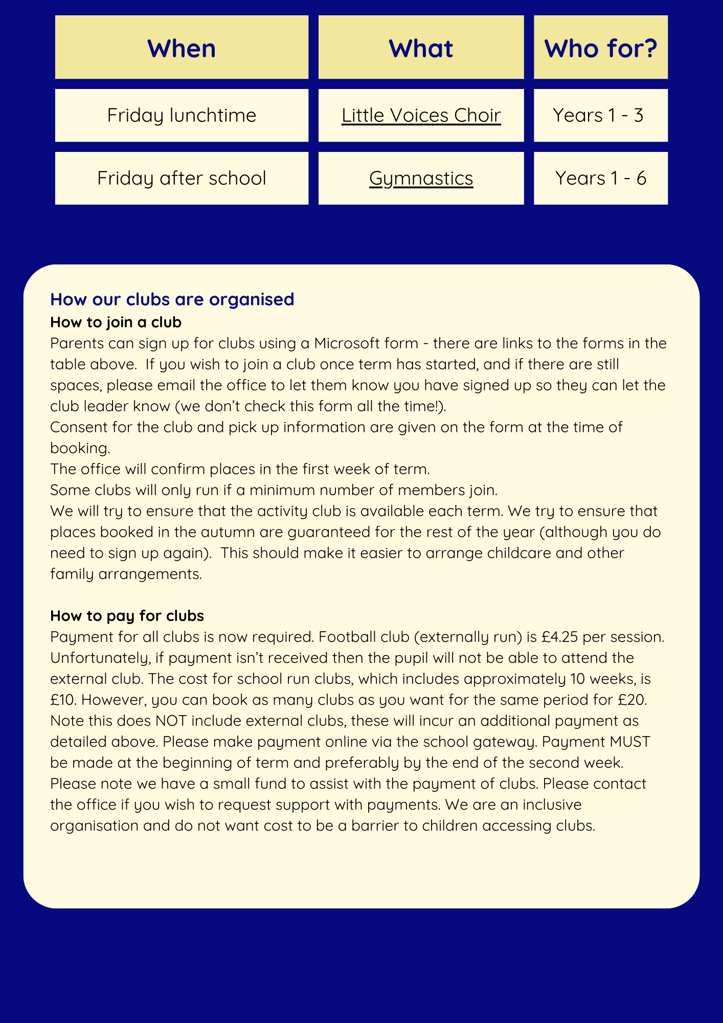 The brochure below shows the clubs that are currently on offer at our school. School-run clubs are booked online via Microsoft Forms links for which are on the letter and brochure. Places are allocated on a first-come, first-served basis and places will be confirmed by the office.