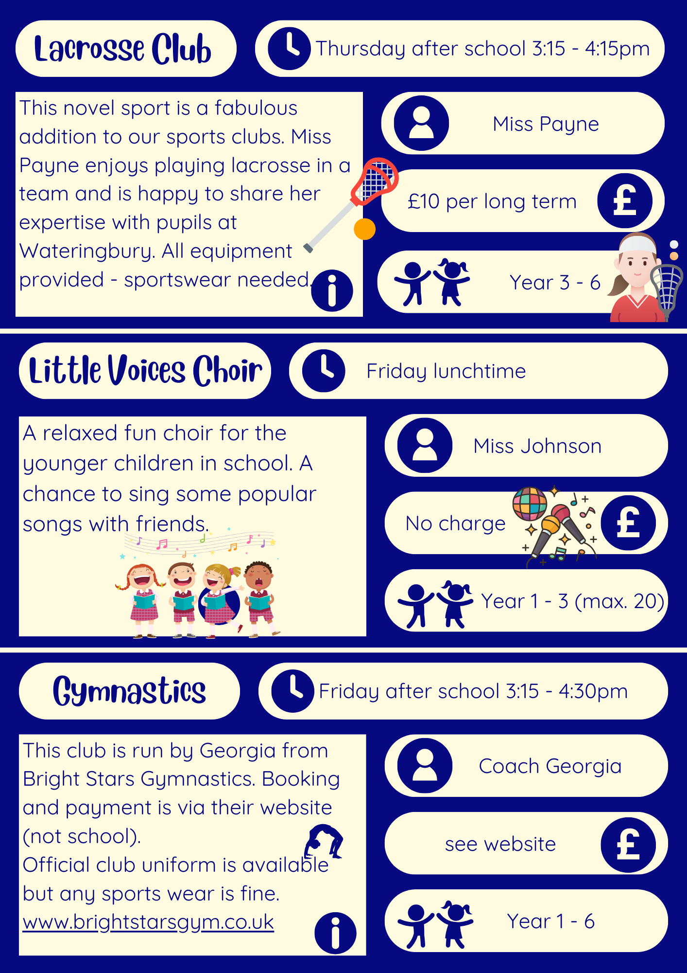 All externally run clubs (apart from gymnastics) are £4.25 per session. Unfortunately, if payment isn’t received, then the pupil will not be able to attend the external club.