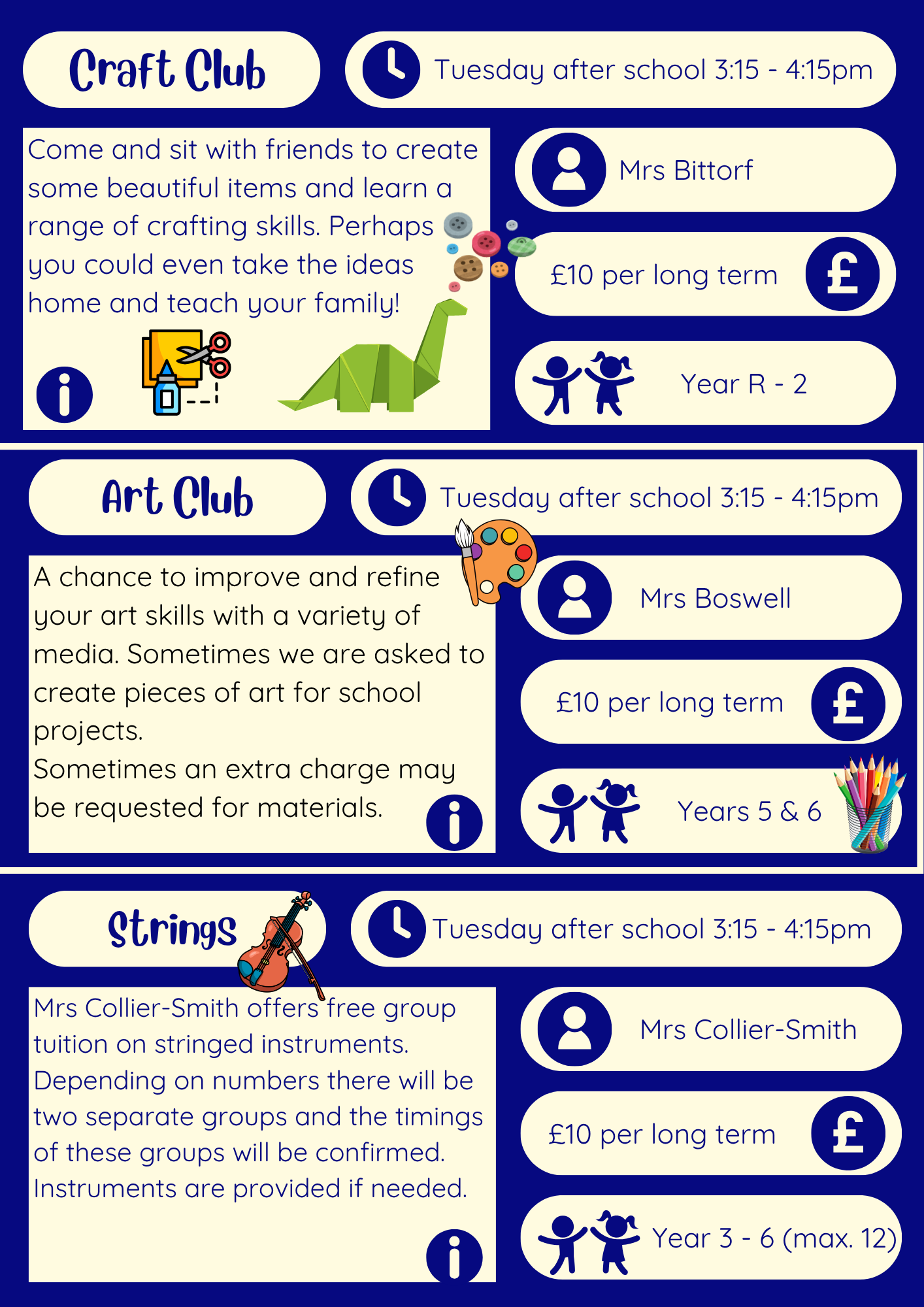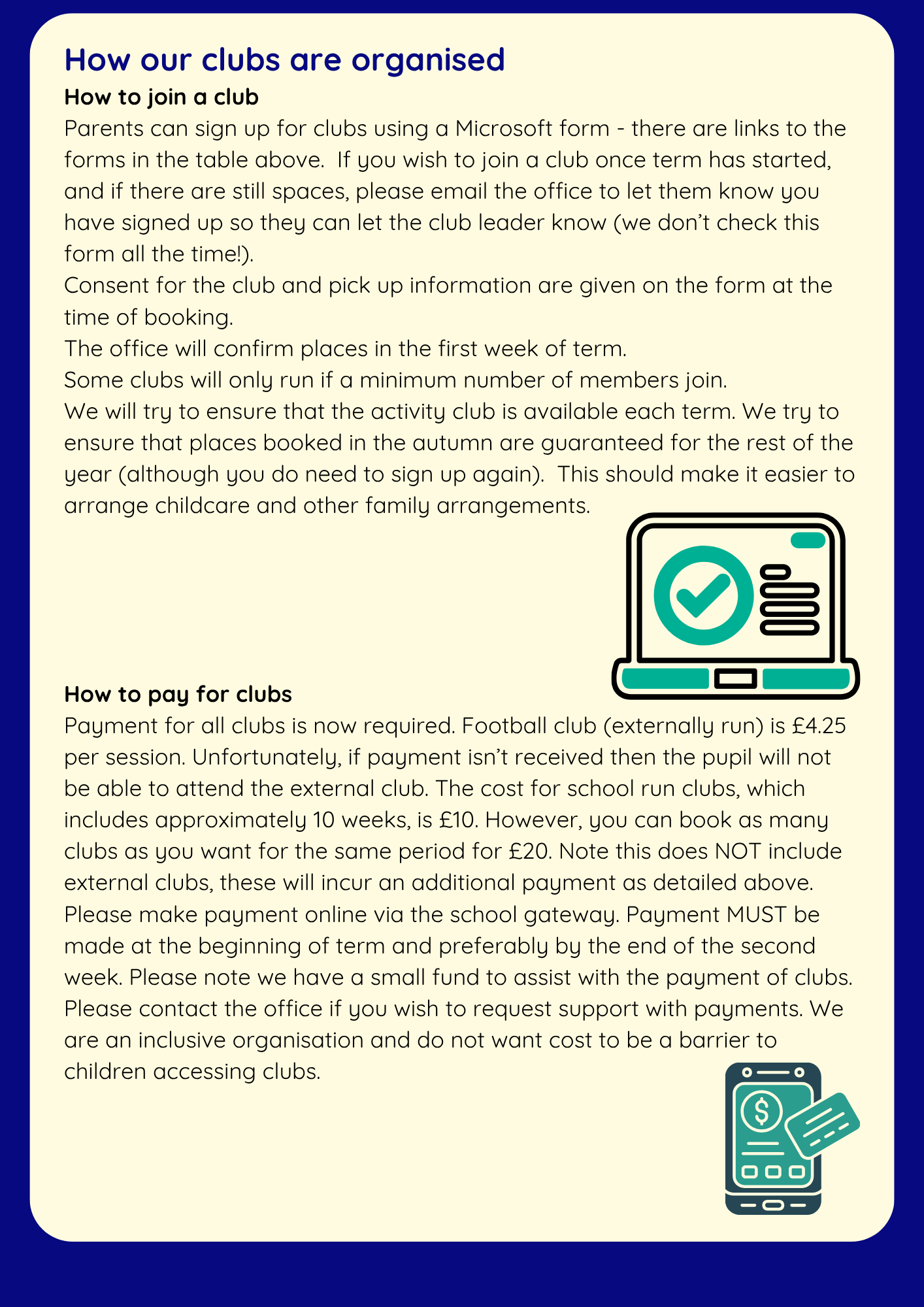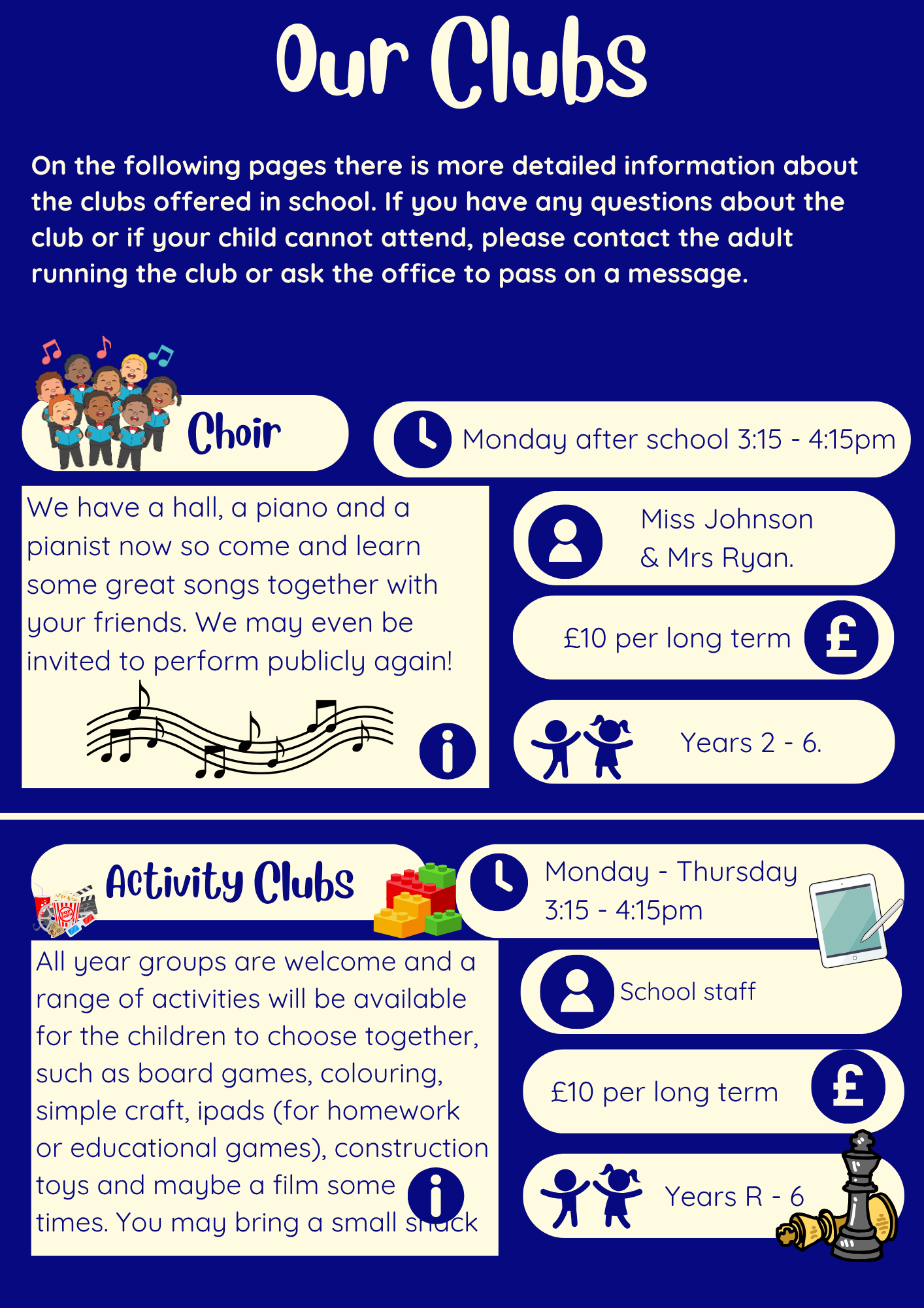 The brochure below shows the clubs that are currently on offer at our school. School-run clubs are booked online via Microsoft Forms links for which are on the letter and brochure. Places are allocated on a first-come, first-served basis and places will be confirmed by the office.