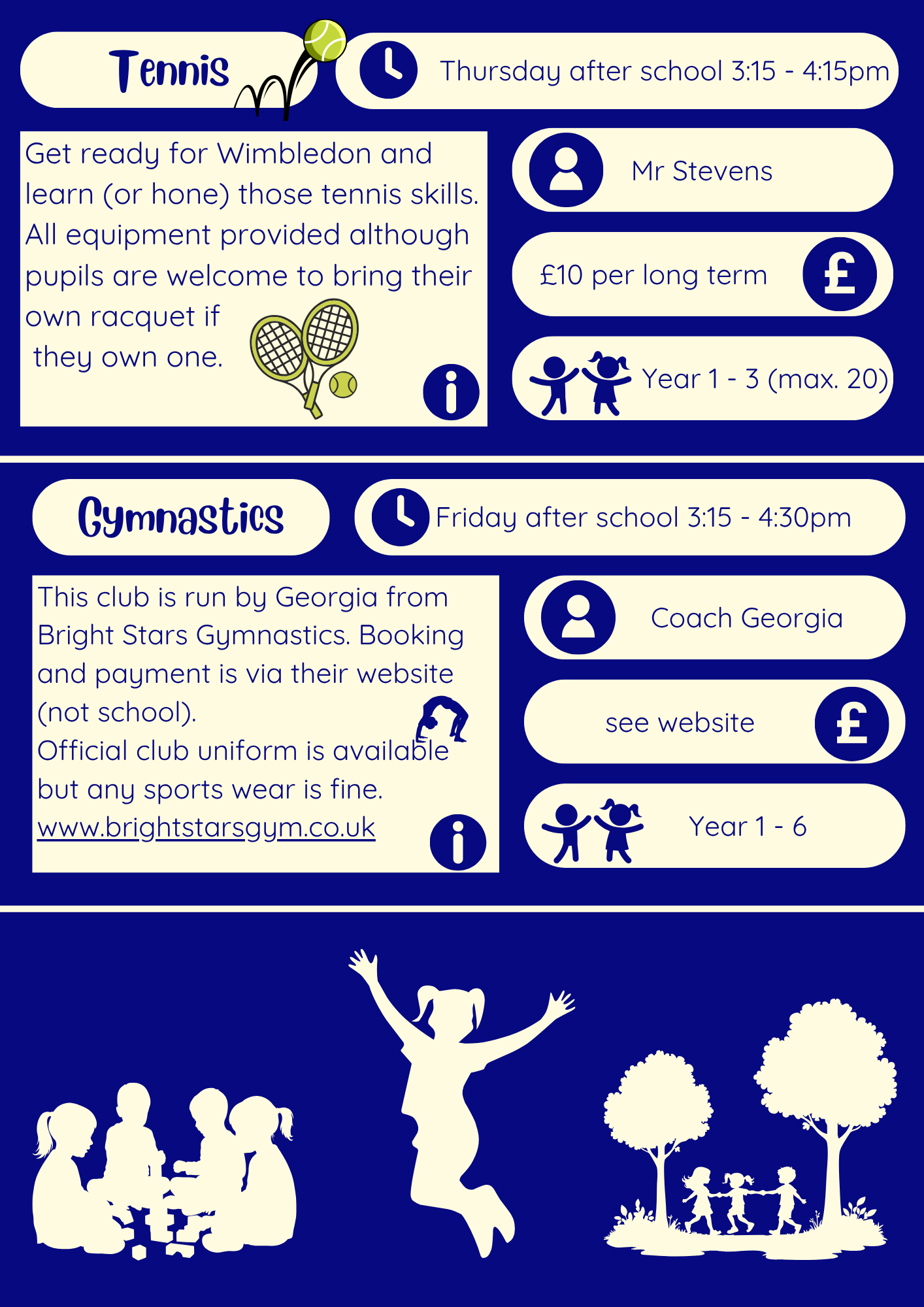 All externally run clubs (apart from gymnastics) are £4.25 per session. Unfortunately, if payment isn’t received, then the pupil will not be able to attend the external club.