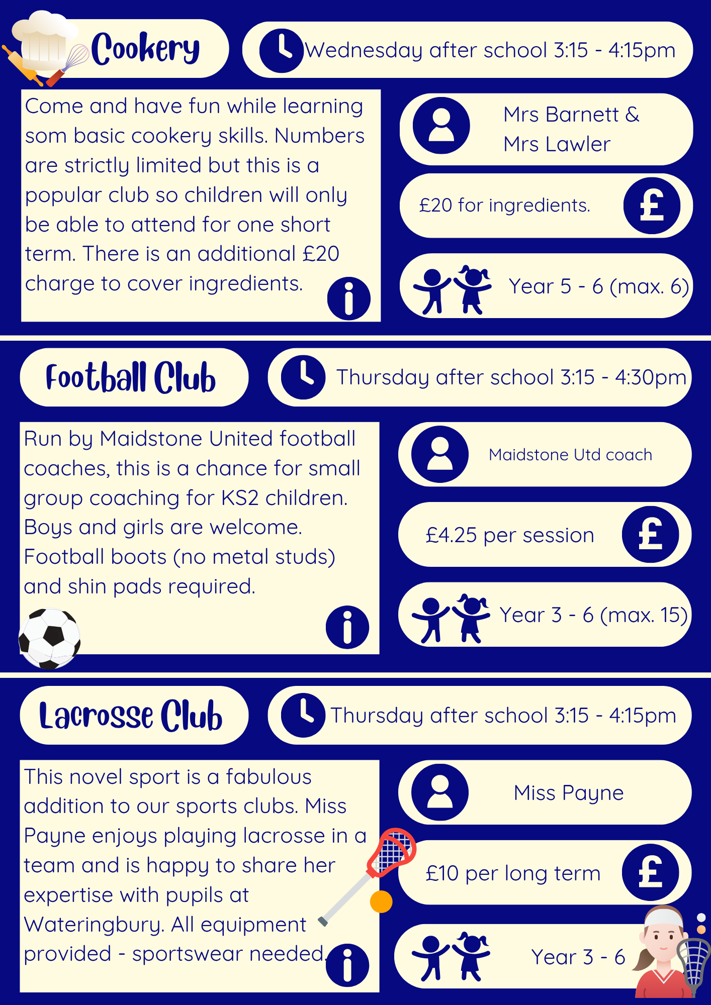 The cost for most school-run clubs, which includes approximately 10 weeks, is £10. However, you can book as many clubs as you want for the same period for £20. Note this does NOT include external clubs or cookery. These will incur an additional payment as detailed in the brochure. Please make payment online via the school gateway or by cash or cheque, payable to Wateringbury Primary School. Payment MUST be made at the beginning of term and preferably by the end of the second week. Please note we have a small fund to assist with the payment of clubs. You will need to contact the office to arrange for this contribution.